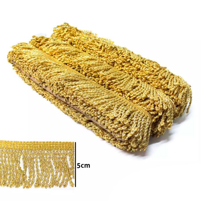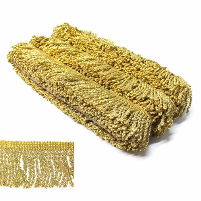 Franja Metalizada Enrolada 12051/P marca São José, pacote contendo cerca de 10 metros de franja dourada de 5cm. A Franja São José Ouro 12050 sendo feita de uma composição única é ideal para confecção e acabamento de roupa e acessórios como bolsas, carteiras, fantasias, cortinas, cangas, tapete, almofadas e artesanato em geral.