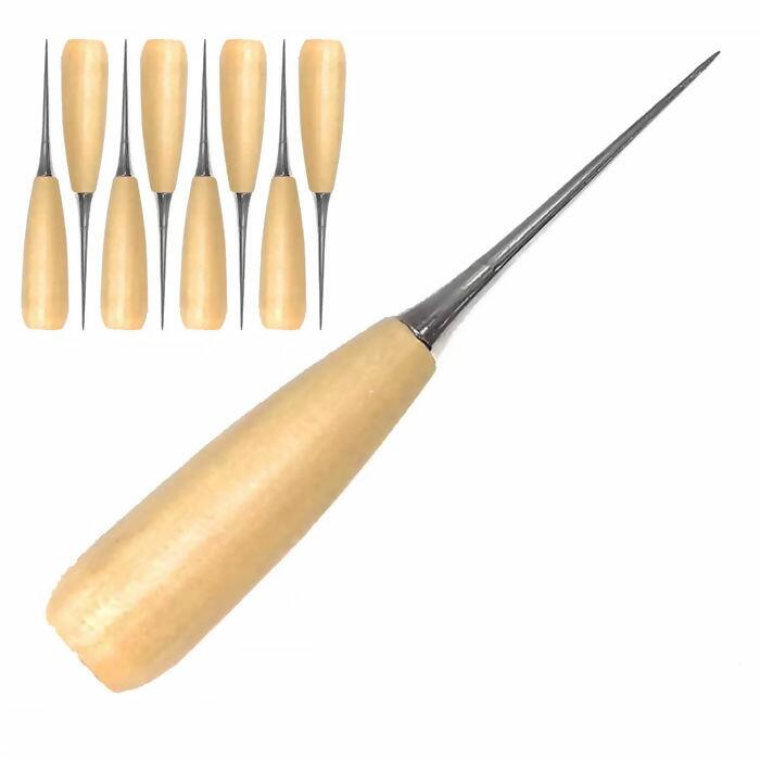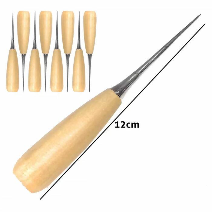 Furador manual profissional com cabo de madeira, ideal para trabalhos de artesanato que exigem perfurações precisas e controladas. Com sua ponta metálica em formato cônico, permite a realização de furos que aumentam de tamanho conforme a profundidade da perfuração, sendo ideal para tecidos, EVA, papel plástico, couro e outros materiais leves. Seu cabo ergonômico em madeira oferece firmeza e conforto no manuseio, garantindo maior controle durante o uso. Ferramenta essencial para artesãos, costureiras e entusiastas do faça-você-mesmo. Caixa com 20 unidades