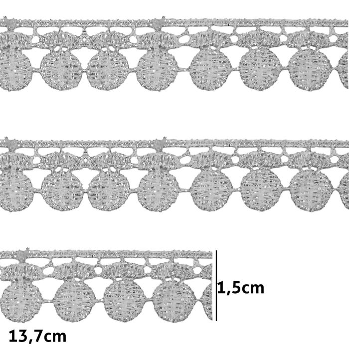 100% Poliéster 1,5cm, perfeito para acabamentos delicados. Possui um visual sofisticado na cor Prata, ideal para realçar suas peças Indicado para artesanatos, decoração de roupas, costura, panos e toalhas.