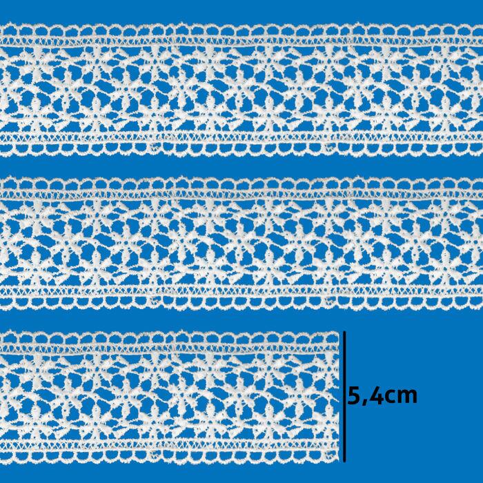 Renda com acabamento delicado e refinado Indicado para artesanato, patchwork, costura criativa, roupas e panos Disponível na cor Branca 13,7m de comprimento e 5,4cm de largura