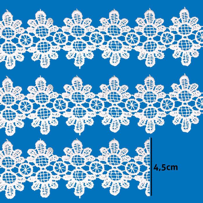 Renda com acabamento delicado e refinado Indicado para artesanato, patchwork, costura criativa, roupas e panos Disponível na cor Branca 13,7m de comprimento e 4,5cm de largura