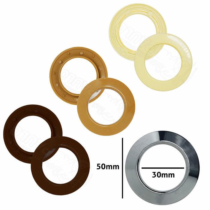 Perfeitos para confecção de cortinas com ilhós e artesanatos em geral, temos em diversos tamanhos, cores e cromado. De ótima qualidade! Feitos de plástico ABS. Cada pacote contém 100 pares de ilhós com diâmetro interno de 30mm e diâmetro externo de 50mm.