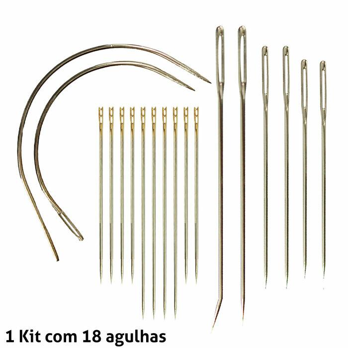 Quantidade: 1 kit contendo 18 agulhas (10 Agulhas para cego, 2 agulhas curvas para colchão, 2 agulhas para estofamento, 1 agulha de tapeceiro, 1 agulha para tecidos pesados, 1 agulha para embalagem, 1 agulha para luva)