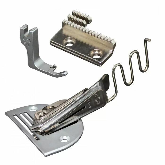 Kit aparelho de viés 2 dobras A10 para máquinas retas industriais, inclui chapa, dente e calcador específico para o aparelho.