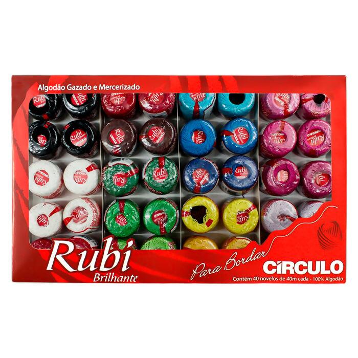 Kit Estojo Linhas Rubi, 1 unidade com 40 linhas de cores diferentes. Rubi tem espessura levemente maior e textura mais marcante no bordado. Possui brilho e cores firmes e é indicado para bicos de crochê, ponto cruz e ponto cheio. Composto 100% por Algodão Gazado e Mercerizado. Caixa com um tamanho de 23cmx37cm e Linhas com 40m cada. TEX 118