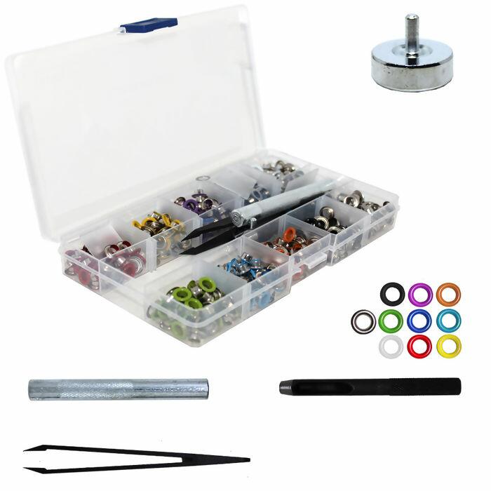 Kit de ilhoses coloridos com vazador e acessórios, indicado para aplicação de ilhós em tecidos e couro.
