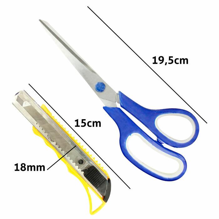 Composição: Aço, Borracha e Plástico 3 cartelas com 1 tesoura e um estilete cada, totalizando 3 estiletes e 3 tesouras A tesoura medindo 19,5cm e o estilete 15cm com lamina de 18mm Cores podem variar de acordo com a disponibilidade em estoque