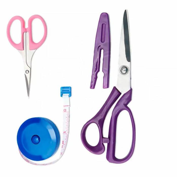 Kit de tesoura para costura com fita métrica, contém duas tesoura, uma pequena de precisão para corte de fios e linha e uma grande de 8 polegadas para corte de tecido com protetor de lâmina, inclui também uma trena semelhante à uma fita métrica com 150cm aproximadamente