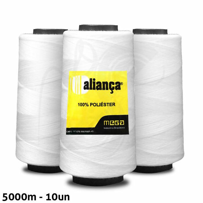 Linha para costura 120 Aliança, pacote contendo 10 rolos de 5000m cada, ideal em praticamente todos os tipos de malhas e tecidos médios ou leves, utilizados também na linha praia e moda íntima, oferecem uma ótima performance na sua costura, ideal para aplicação em máquinas de alta, média e baixa rotação, ótimo desempenho na sua costura.