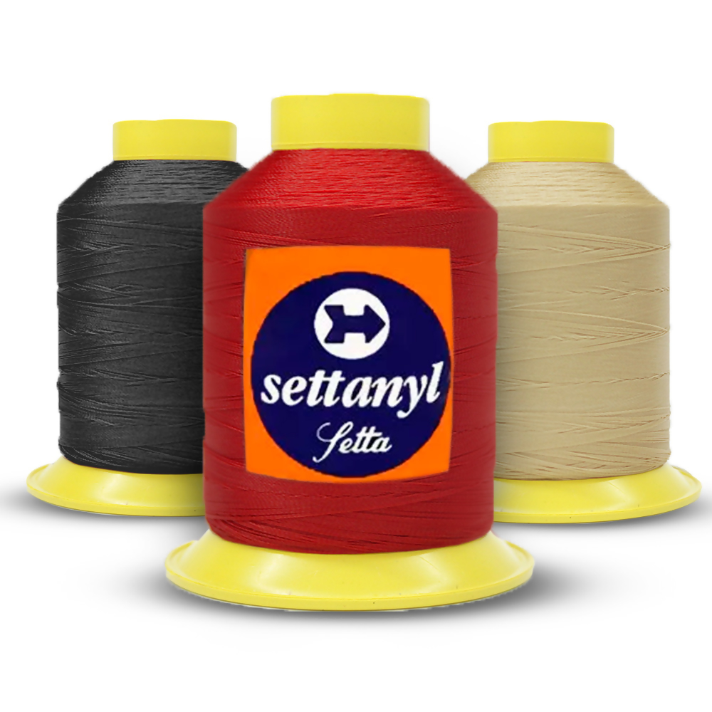 Linhas 100% Poliamida de Nylon marca Settanyl, rolo contendo aproximadamente 80 gramas de linha. Possui uma composição de Nylon forte plastificado que garante maior resistência. Utilizadas nas costuras de calçados, bolsas, pastas, mochilas, bancos de automóveis, estofados, colchões, blaqueação de calçados, bolas, etc. Normalmente utilizada em materiais de baixo encolhimento, como tecidos grossos, couros e assemelhados.