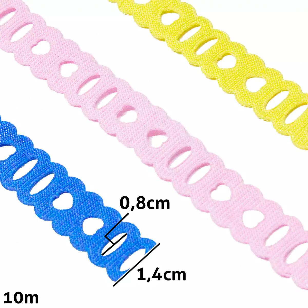 Passa Fita disponível em várias cores Contém 1,4 cm de largura Furo possui 0,8 cm Possui 10m de comprimento Ideal para artesanato, decoração, patchwork, pano e toalhas