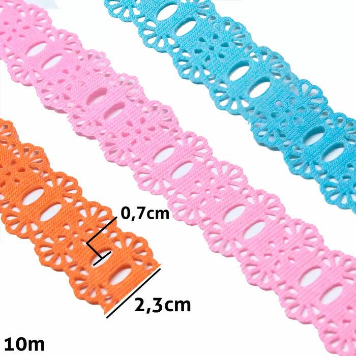 Passa Fita disponível em várias cores Contém 2,3 cm de largura Furo possui 0,7 cm Possui 10m de comprimento Ideal para artesanato, decoração, patchwork, pano e toalhas