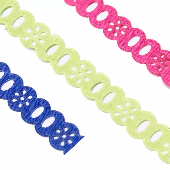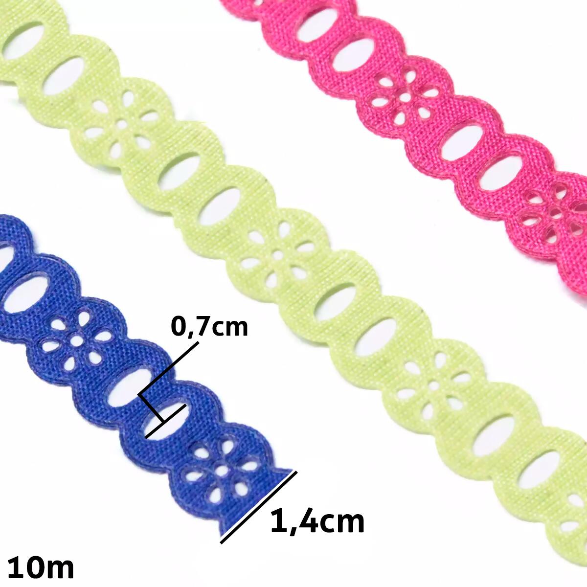 Passa Fita disponível em várias cores Contém 1,4 cm de largura Furo possui 0,7 cm Possui 10m de comprimento Ideal para artesanato, decoração, patchwork, pano e toalhas