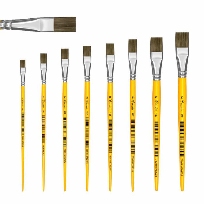 O Pincel 167 é composto por cabo curto de madeira, Virola de Metal, Filamento de Pelo de Camelo, em Formato Chato Curto.