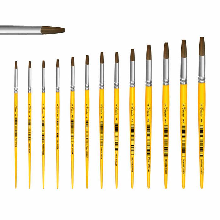 O Pincel 166 é composto por cabo curto de madeira, Virola de Metal, Filamento de Pelo de Camelo, em Formato Chato Redondo.