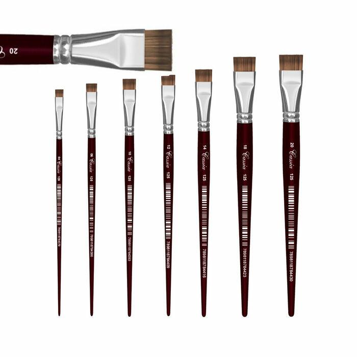 O Pincel 125 é composto por cabo longo de madeira, Virola de Metal, Filamento de Pelo de Texugo, em Formato Chato Curto.