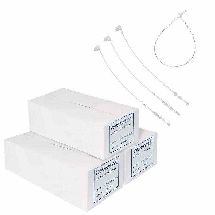 Tag Trava Anel Transparente, 10 caixas contendo 5000 unidades cada, totalizando 50.000 unidades. Este pino é utilizado em materiais que não podem ser perfurados e é aplicado manualmente. Feito de plástico com tamanhos de 75mm e 175mm