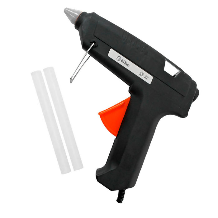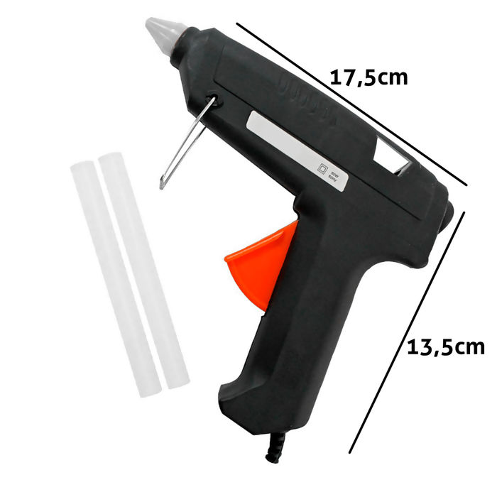 Aplicador de cola quente para tubos de cola grande na cor preta. A Pistola Cola Quente é ideal para aplicação tecidos; madeira; vidro; plástico; metal; cerâmica entre outras. A pistola acompanha 2 tubos curtos de cola quente e um apoio para a pistola.
