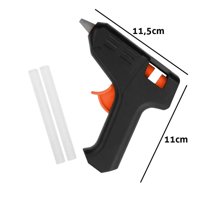 Aplicador de cola quente para tubos de cola grande na cor preta. A Pistola Cola Quente é ideal para aplicação tecidos; madeira; vidro; plástico; metal; cerâmica entre outras. A pistola acompanha 2 tubos curtos de cola quente e um apoio para a pistola.