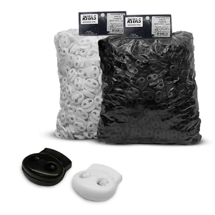 Ponteira 270 marca Ritas modelo Focinho de Porco disponível nas cores preto e branco, pacote contendo cerca de 1000 unidades do regulador. O Regulador 270 Ritas é indicado para os mais diversos cordões e elástico de até 5mm de diâmetro.