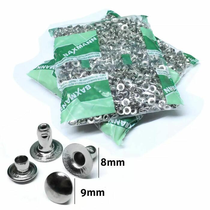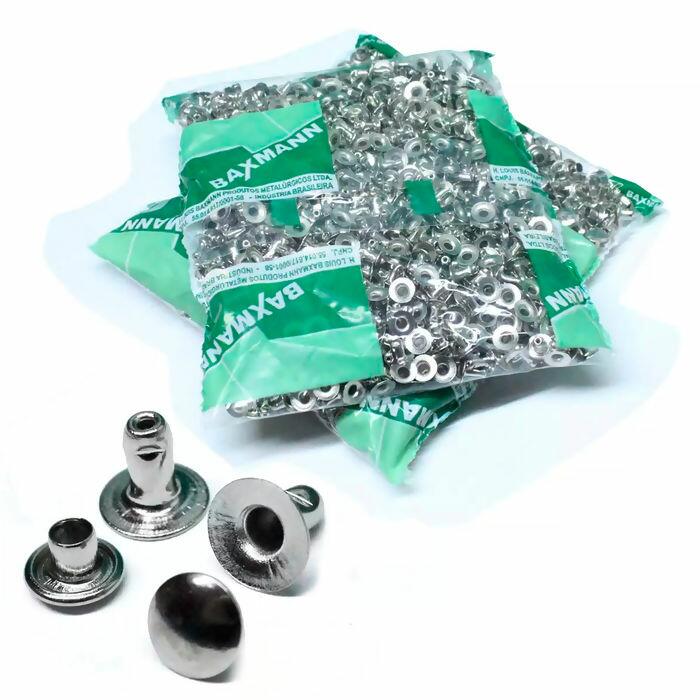 Rebite 2 ilhós com calota marca Baxmann feito totalmente de ferro niquelado, cada pacote contém cerca de 1000 unidades com rebite de 8mm e calota de 9mm. O Rebite é utilizado na confecção de roupas de tecidos pesados e jeans para fixar e decorar. Contém calota para dar um melhor acabamento à peça.