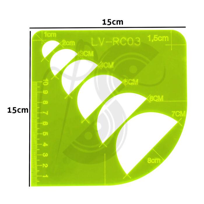 Régua para patchwork e scrapbook no formato quadrado de 15cm x 15cm, feita de material resistente e transparente, com escala de até 10cm em centímetros e marcações precisas. Possui moldes internos para arcos que variam de 1cm a 8cm, facilitando a criação de curvas e recortes com precisão. Essa régua é ideal para modelagem, corte de tecidos, trabalhos com papel, confecção de moldes, patchwork, costura criativa e projetos de artesanato em geral. Ferramenta versátil e indispensável para quem busca praticidade e perfeição no acabamento.