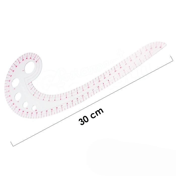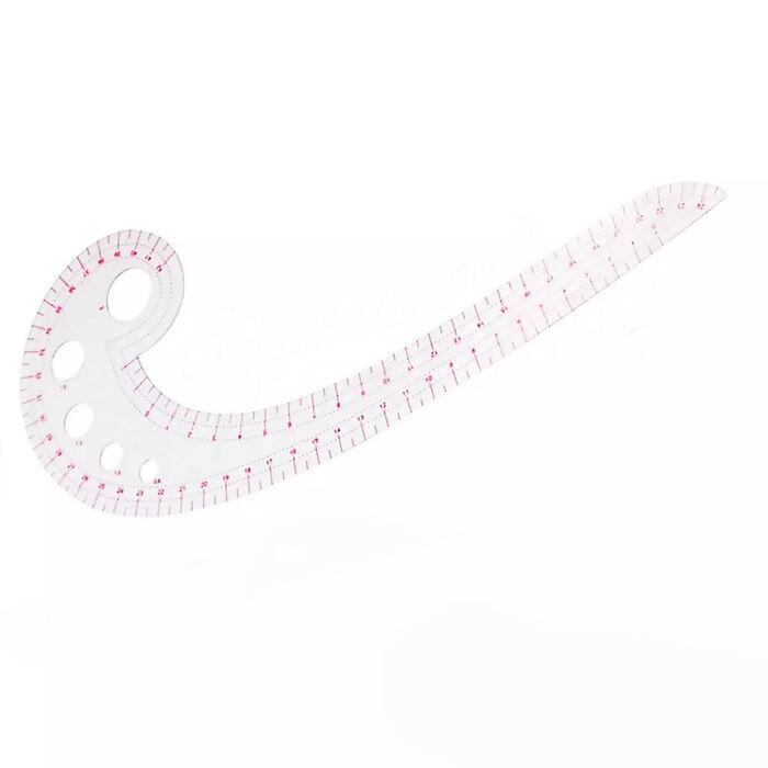 Régua curva para costura com graduação de 42cm (centímetros e meio-centímetros) e 5 furos para criação de círculos de tamanhos diferentes, ideal para desenhar e ligar curvas, de maneira que elas fiquem encaixadas sem precisar fazer cálculos. Feita de plástico flexível.