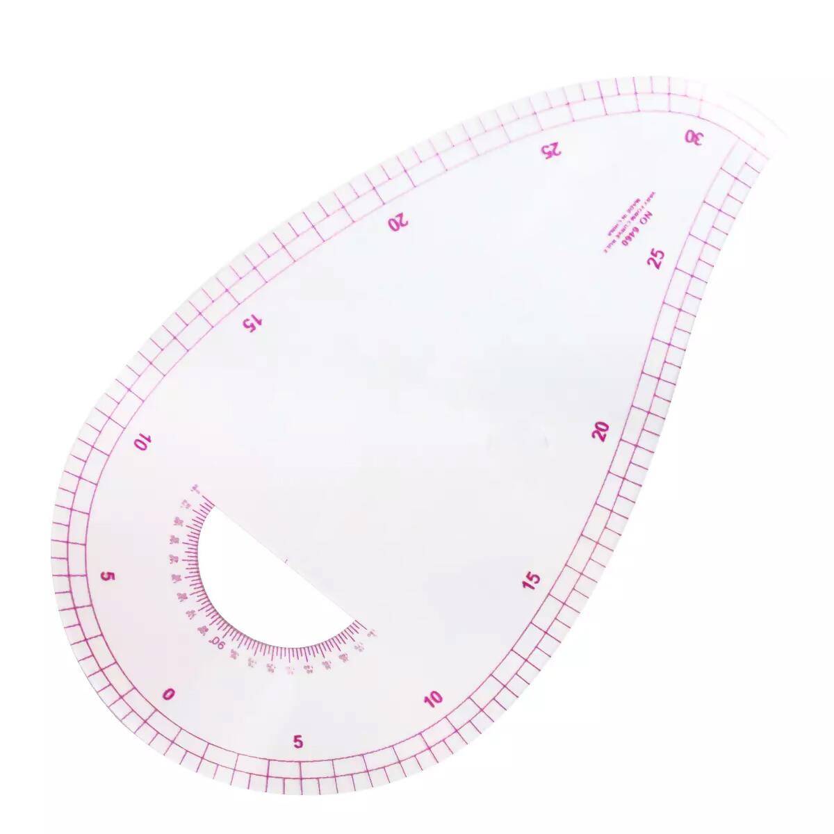 Régua em gota para costura com graduação até 30cm ao redor da régua, ideal para desenhar e ligar curvas, de maneira que elas fiquem encaixadas sem precisar fazer cálculos. A régua possui um pequeno transferidor para ângulos. Feita de plástico flexível.