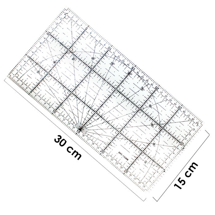 Feita em acrílico durável e transparente, facilita a visualização do tecido. Perfeita para criar cortes grandes precisos Marcações de ângulos de 15º, 30º, 45º, 60º e 75º Régua com 15cmx30cm