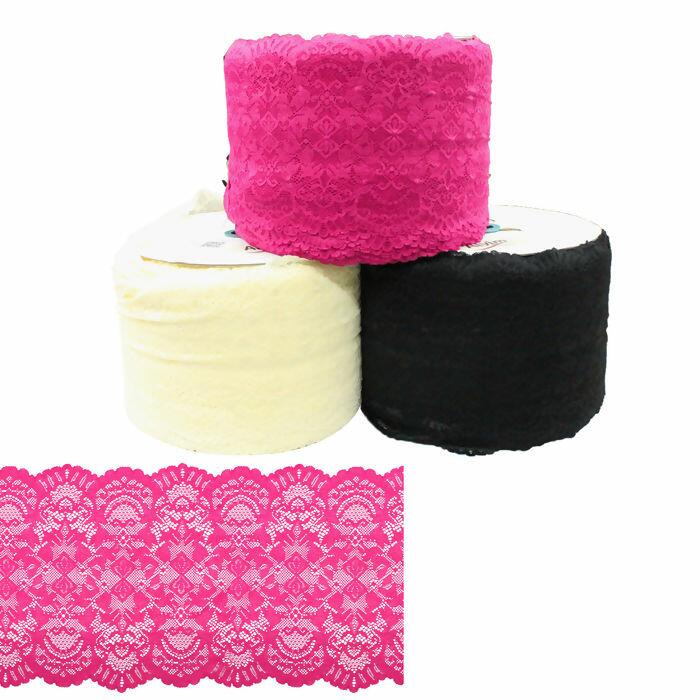 Renda com elastano Ref. 146 com 18 centímetros de largura. A Renda Elástica 146 possui um brilho de cetim incrivel, sendo ideal para confecções e acabamento de calcinha, sutiã, camisola, body, regatas e muito mais!