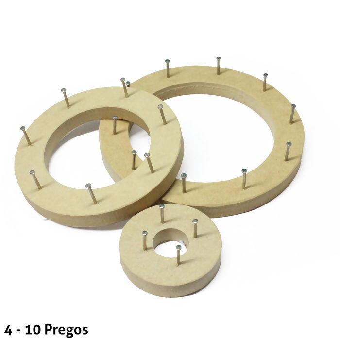 Tear circular feito de madeira composto de uma série de pregos. O Tear de Pregos Circular com 7 e 10 pregos é indicado para confecção de peças como toucas enquanto o de 4 pregos é ideal para utilizar a técnica rabo de rato.