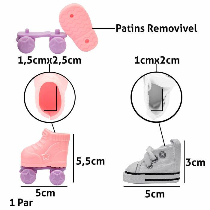 Ideal para criar amigurumis mais charmosos e modernos Patins rosa, com roda removivel no tamanho de 5cmx5,5cm Feitos de plástico e tecido, proporcionando estilo e durabilidade Tênis de cano alto inspirados na moda de rua, com tamanho de 3,2cmx5cm