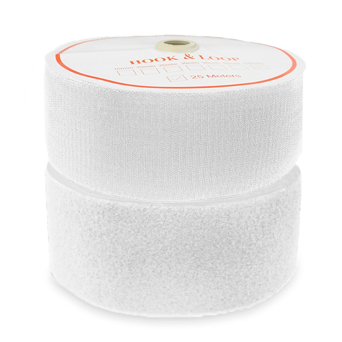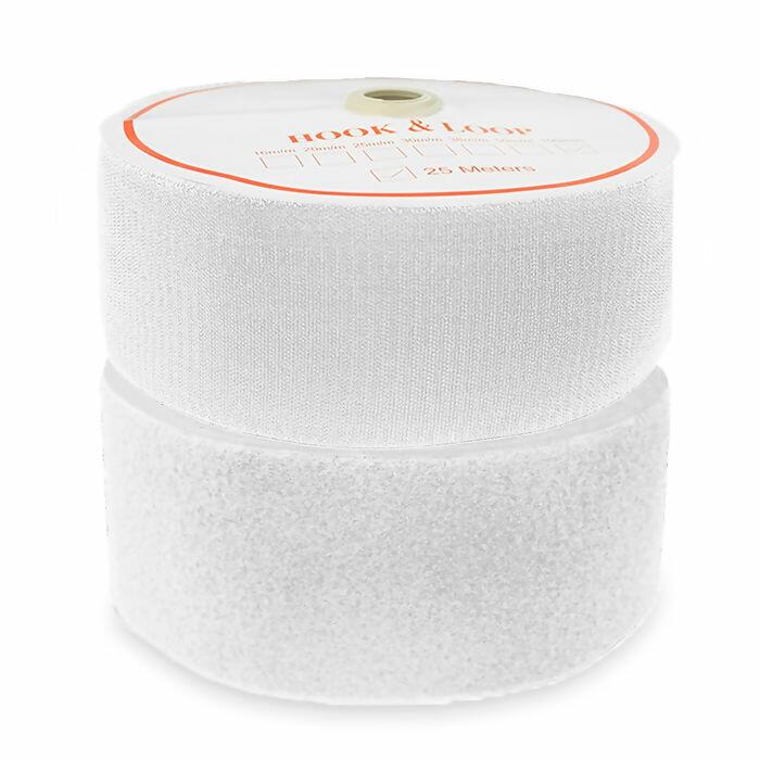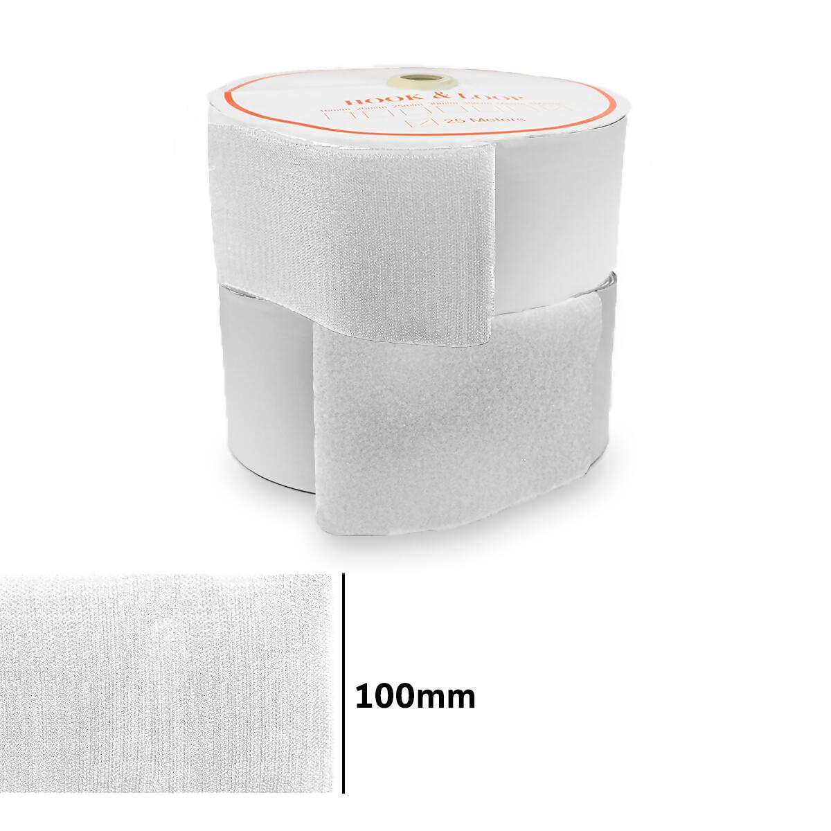 Cor Branco 100mm de largura x 25m de comprimento Feito por 30% Nylon e 70% Poliéster Fixação forte com adesivo no verso Abre e fecha várias vezes Útil para artesanato, vestuários, fixação e veículos