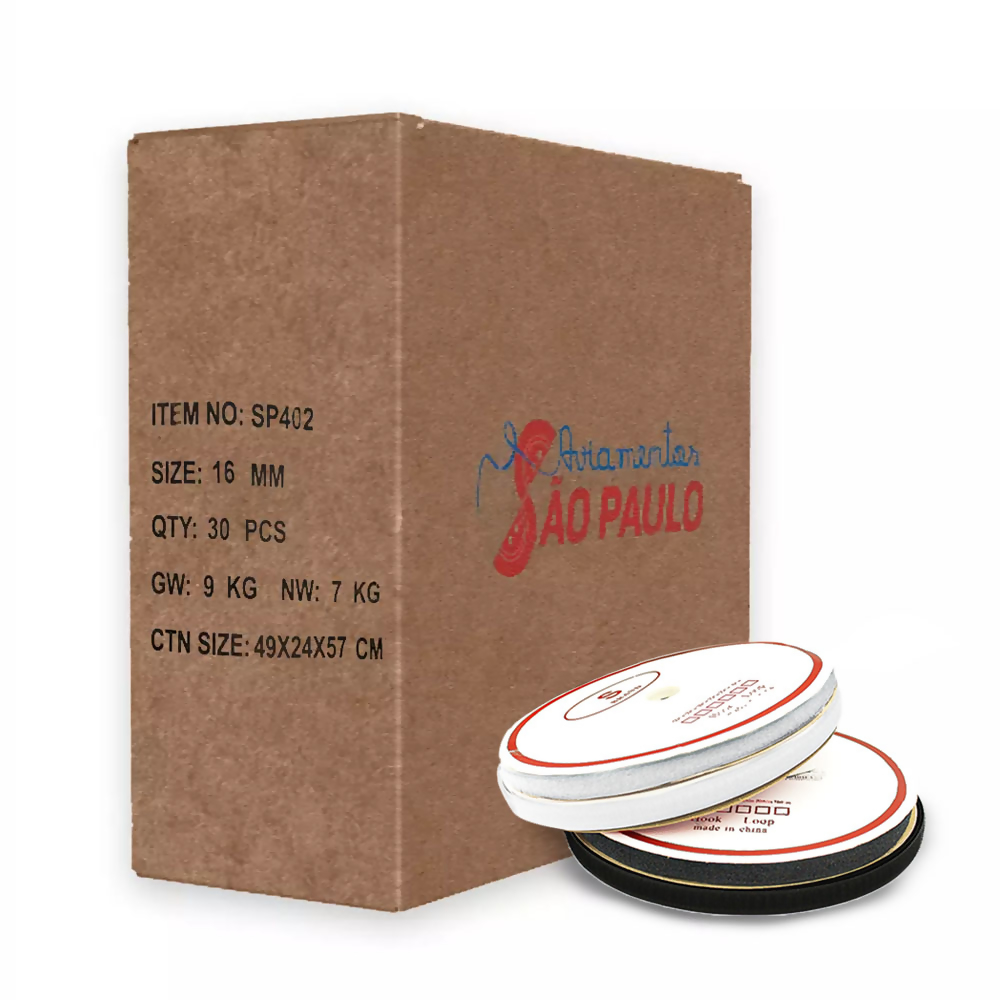 O Velcro para costura SP402, caixa com 30 Pares (Macho e Fêmea). Usado para artesanato, vestuários, fixação e organização. Feito com 30% Nylon e 70% Poliéster com uma largura de 16mm e um comprimento de 25m.