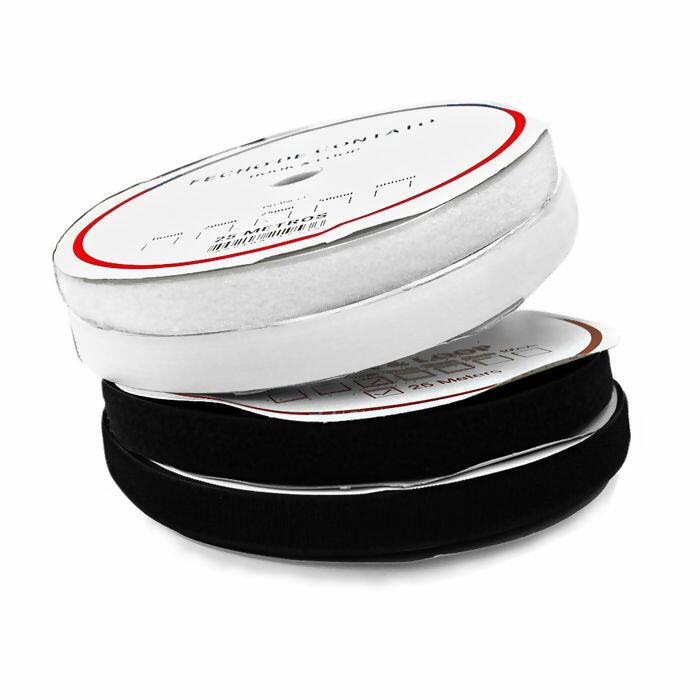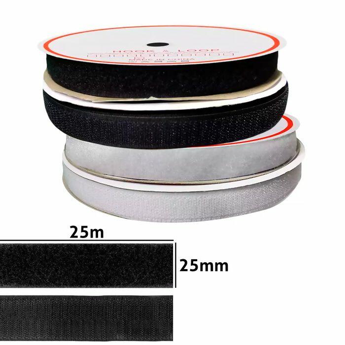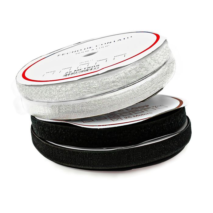 Velcro para costura na cor preto ou branco possui várias utilidades. Usado para artesanato, vestuários, fixação e organização. Com 25mm de largura e 25 metros de comprimento, feito com 30% Nylon e 70% Poliéster