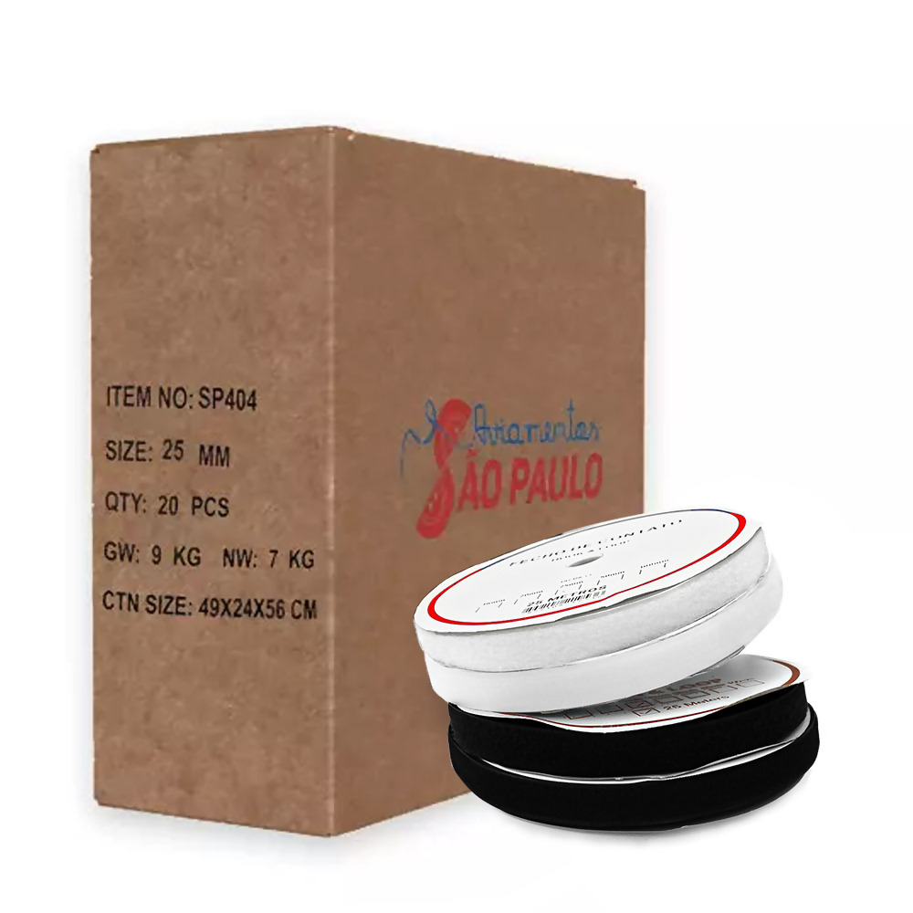 O Velcro para costura SP404, caixa com 20 Pares (Macho e Fêmea). Usado para artesanato, vestuários, fixação e organização. Feito com 30% Nylon e 70% Poliéster com uma largura de 25mm e um comprimento de 25m.