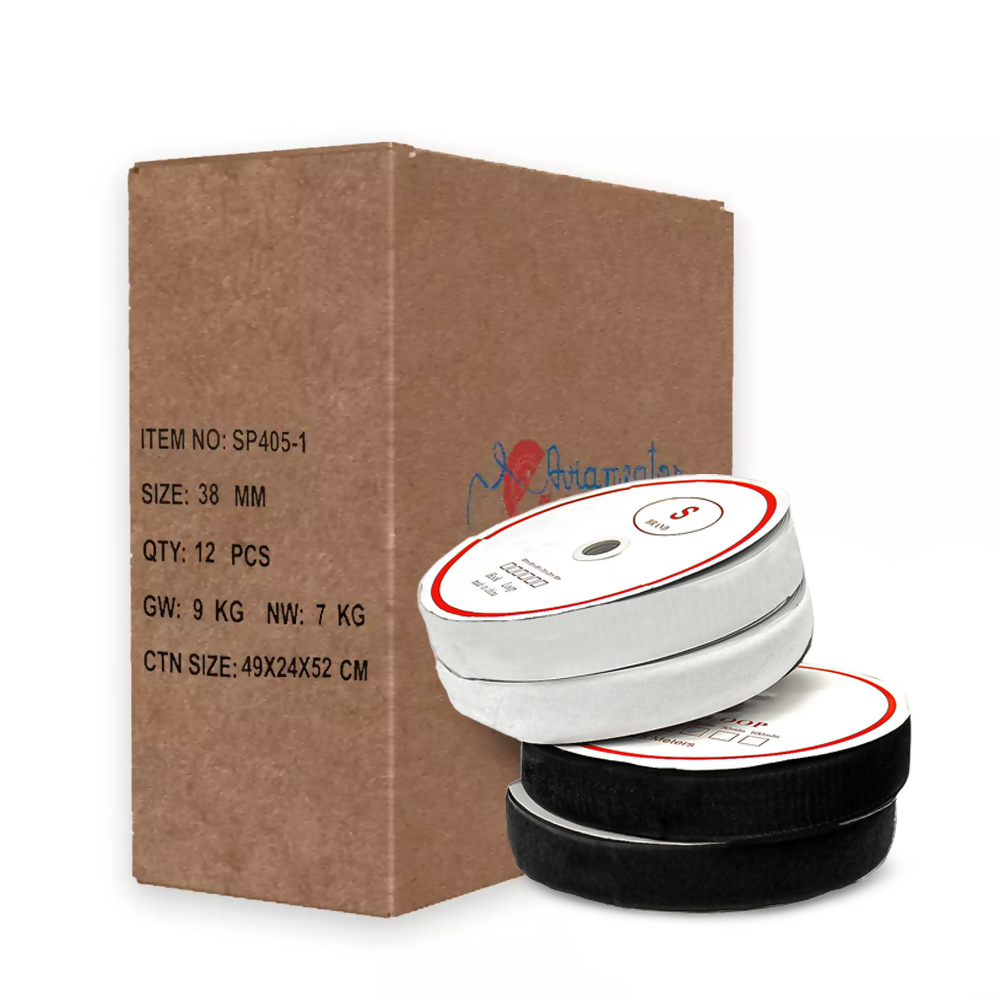 O Velcro para costura SP405, caixa com 12 Pares (Macho e Fêmea). Usado para artesanato, vestuários, fixação e organização. Feito com 30% Nylon e 70% Poliéster com uma largura de 38mm e um comprimento de 25m.