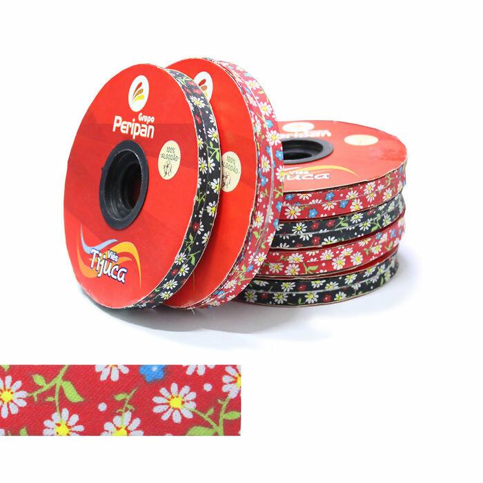 Viés Destaque 9800 marca Peripan com estampa de margaridas no fundo preto e vermelho feito 100% de algodão com 24mm de largura aberto e 20 metros de comprimento. Estando disponível em diversas cores, o viés Destaque Algodão pode ser utilizado em acabamentos, artesanato, costura e muito mais!