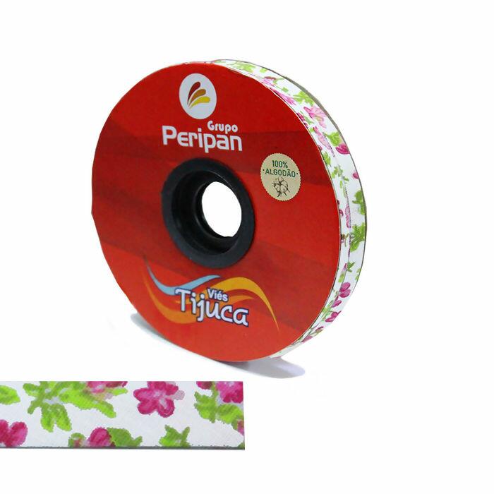 Viés Destaque 9800 marca Peripan com estampa de rosas no fundo branco feito 100% de algodão com 24mm de largura aberto e 20 metros de comprimento. Estando disponível em diversas cores, o viés Destaque Algodão pode ser utilizado em acabamentos, artesanato, costura e muito mais!
